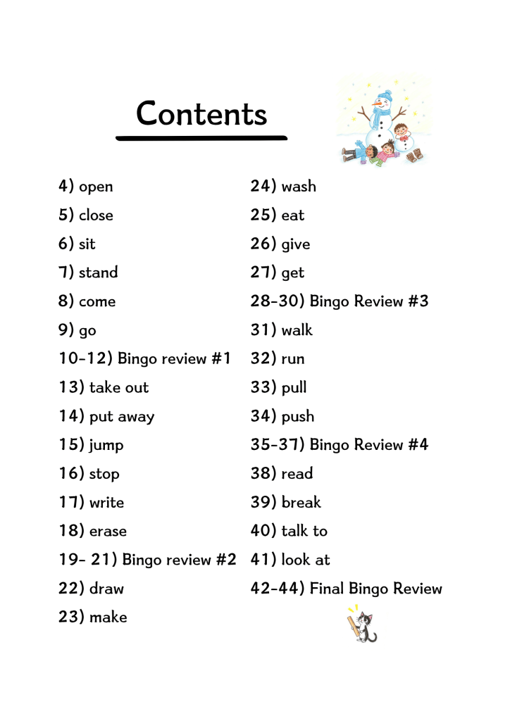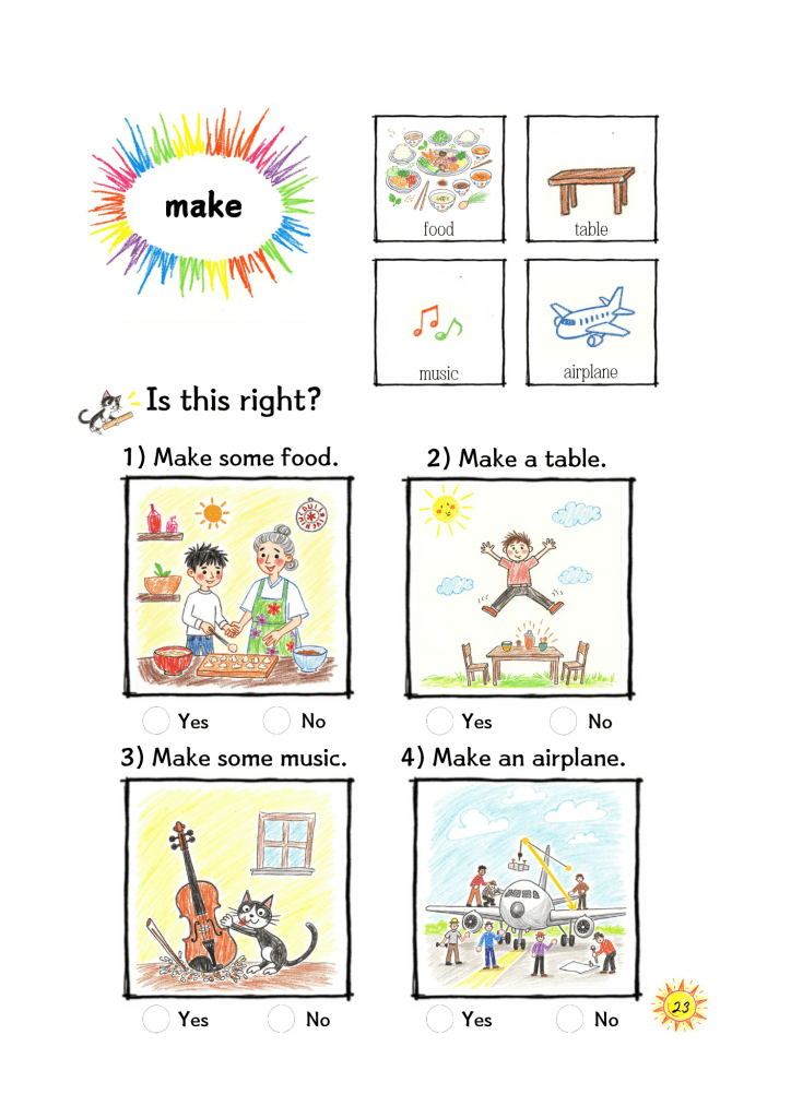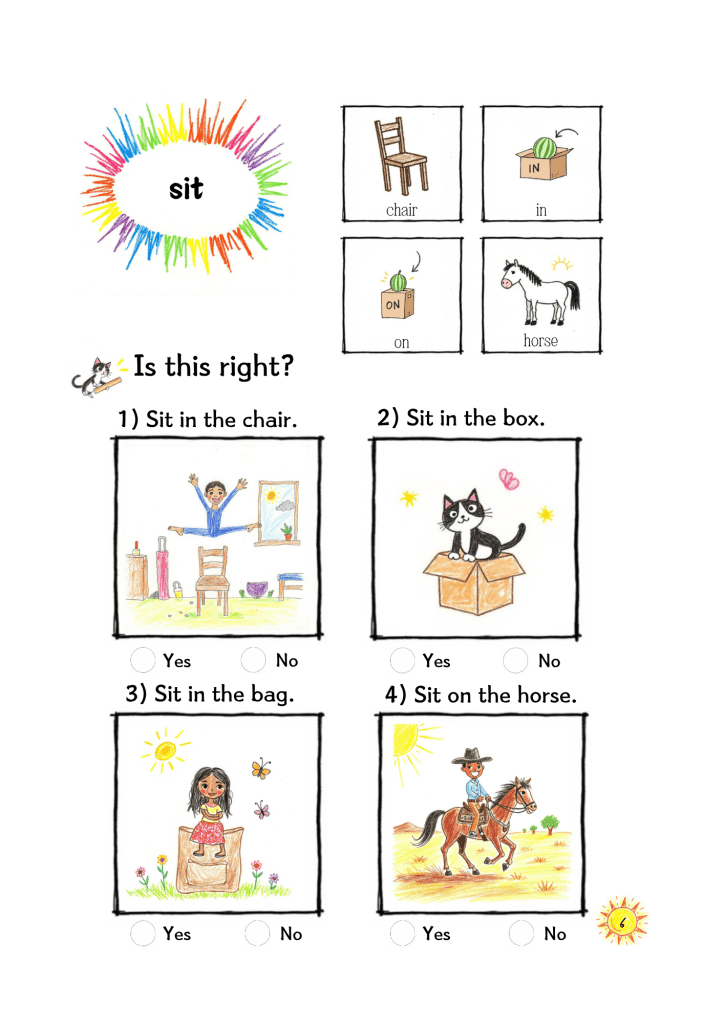 Each of the main pages has a central verb and four high-frequency terms with their meanings clearly shown. Using TPR techniques, teachers can easily demonstrate the verbs and even before having mastered the alphabet, students will love the playful challenge of yelling “Yes!” and “No!!”